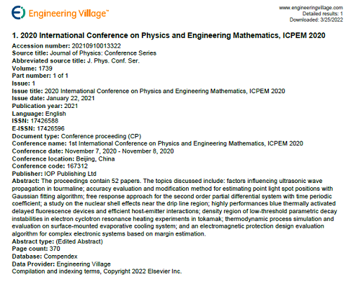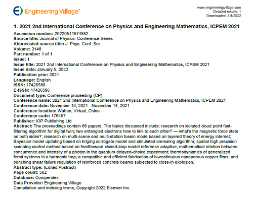 - ICPEM 2020; ICPEM2021 has been published by IOP Publishing and indexed by EI ! [2022-03-01]